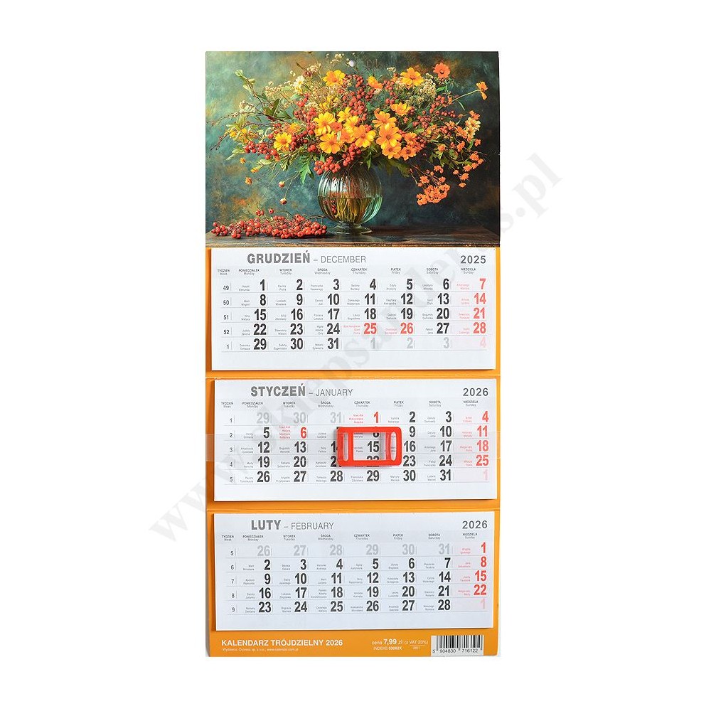Trójdzielny kalendarz na rok 2026 w formacie 22 x 46 cm.