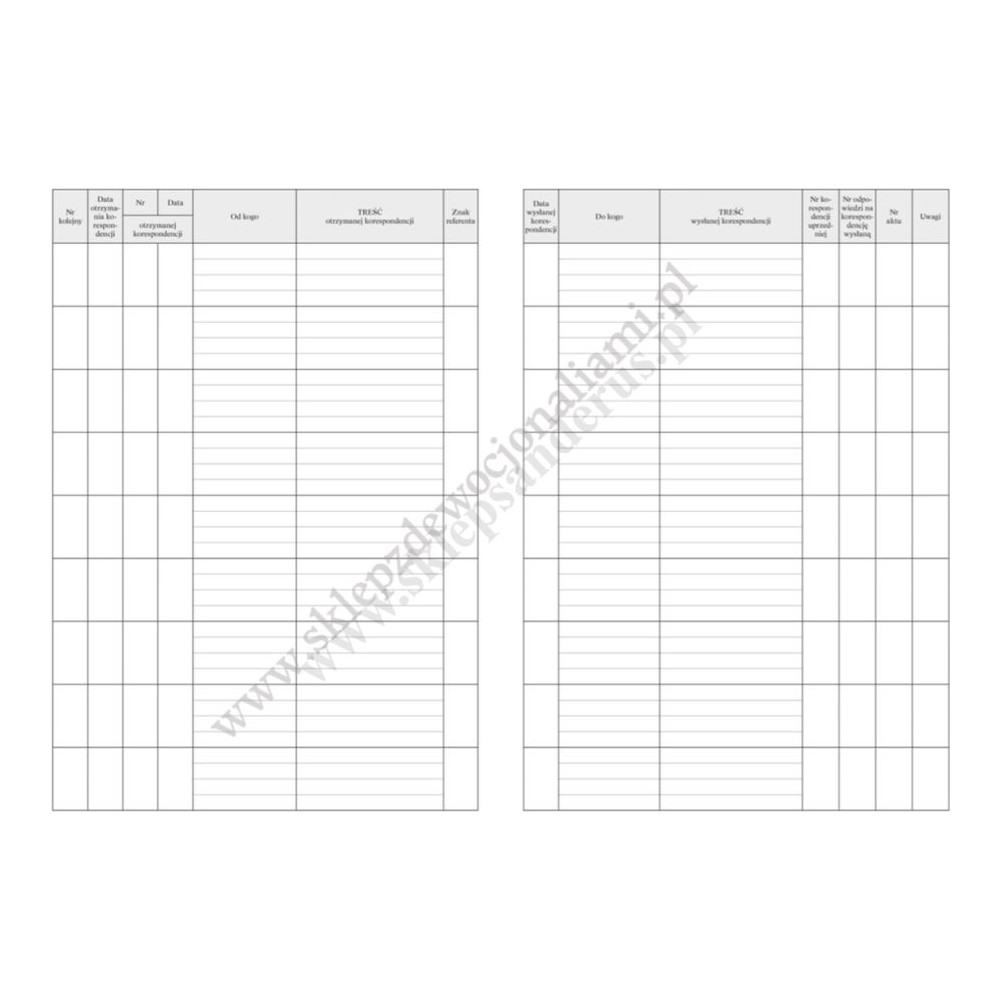 Nowe opracowanie, zawiera wszystkie rubryki niezbędne do rejestrowania korespondencji przychodzącej i wychodzącej z parafii, niezbędna w każdym biurze parafialnym (numer porządkowy, data otrzymania lub wysłania korespondencji, nadawca lub odbiorca, treść, znaki umieszczane na korespondencji, numery aktów – jeśli korespondencja takich dotyczy i uwagi). Księga umożliwia prowadzenie pełnego rejestru korespondencji urzędowej parafii. Jedna rozkładówka zawiera 9 miejsc na wpis, co łącznie daje 1071 pozycji w całej księdze.