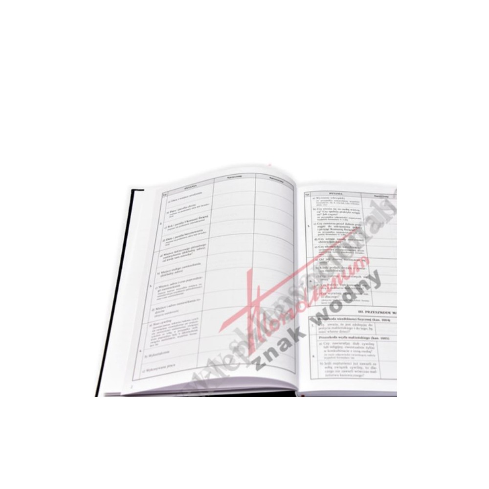 Księga, w której zebrano i oprawiono razem 29 formularzy rozmów kanoniczno-duszpasterskich z narzeczonymi obowiązujących od 1 czerwca 2020 r., a wprowadzonych Dekretem ogólnym Konferencji Episkopatu Polski. Są to te same protokoły, które sporządza się zwykle na luźnych arkuszach. Każdy z nich ma 8 stron. Jej zaletą jest przechowywanie kilkudziesięciu formularzy w jednym miejscu.