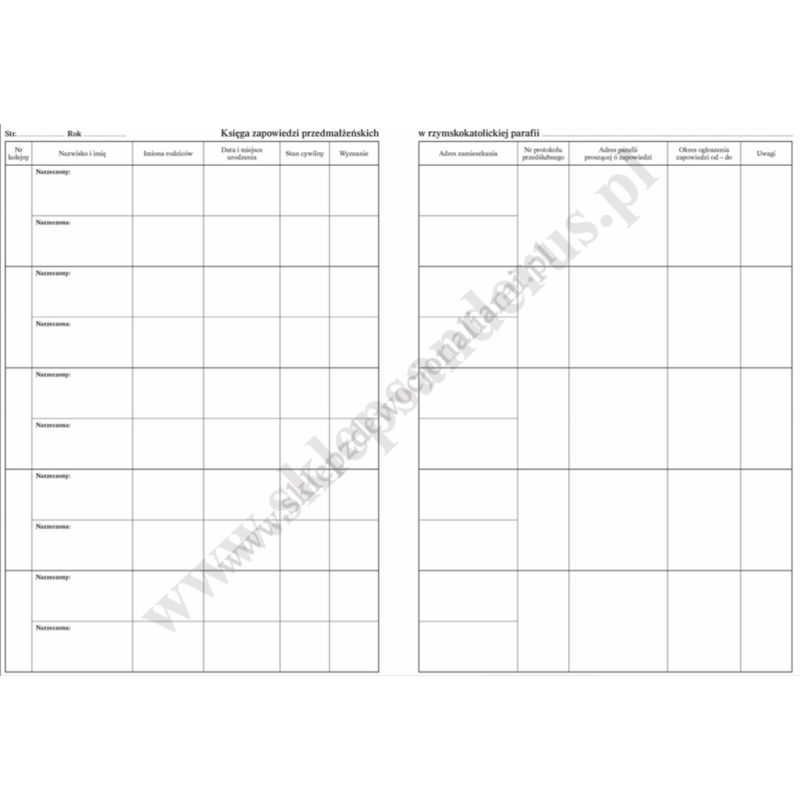 Zupełnie nowe opracowanie, zawiera dużo więcej rubryk, niż dotychczas stosowana w biurach parafialnych księga zapowiedzi, na wpisanie danych narzeczonych: nazwisko i imię, imiona rodziców, data i miejsce urodzenia, stan cywilny, wyznanie, adres zamieszkania, nr protokołu, adres parafii proszącej o zapowiedzi, okres ich ogłoszenia i uwagi. Księga może pomieścić 595 wpisów, po 5 na każdej rozkładówce.