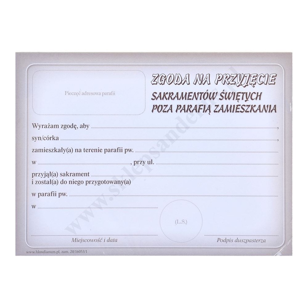 ZGODA NA PRZYJĘCIE SAKRAMENTÓW ŚWIĘTYCH POZA PARAFIĄ ZAMIESZKANIA - format 14 x 10.3 cm - 76163