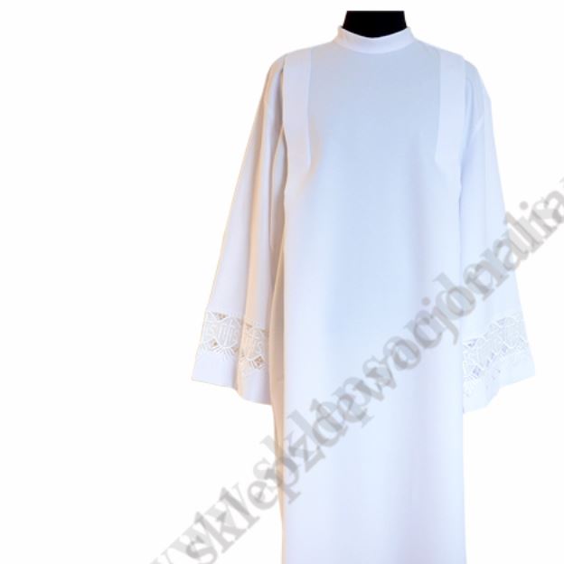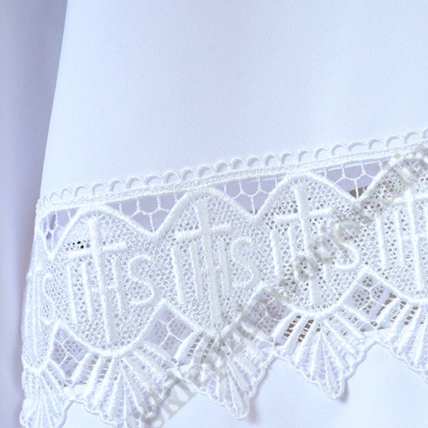 Alba kapłańska wykonana z żorżety, wykończona gipiurą z dodatkową wstawką IHS - wzrost 164. Inne rozmiary znajdują się poniżej w produktach powiązanych.