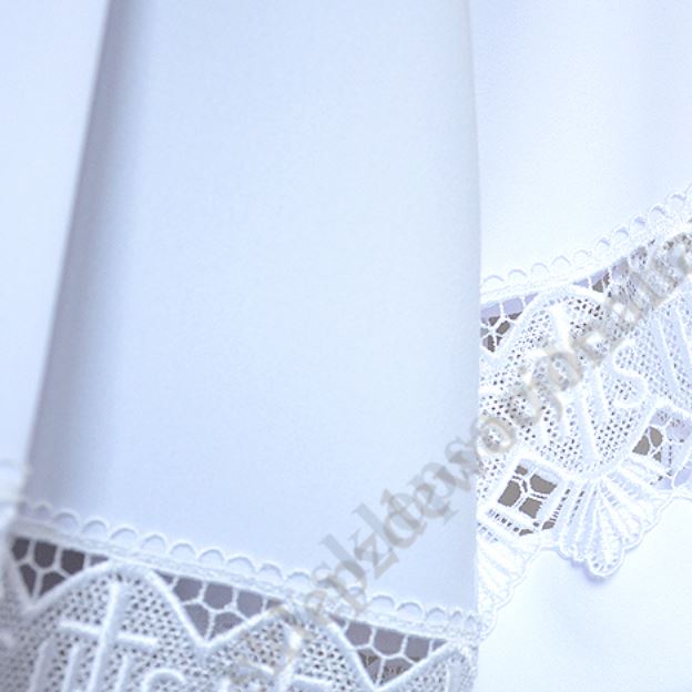 Komża kapłańska wykonana z żorżety, wykończona gipiurą z dodatkową wstawką IHS - wzrost 170. Inne rozmiary znajdują się poniżej w produktach powiązanych.
