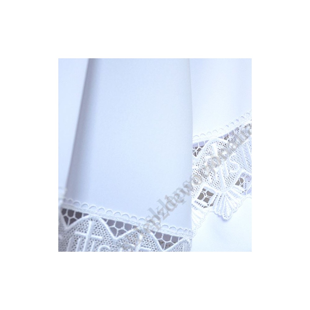Komża kapłańska wykonana z żorżety, wykończona gipiurą z dodatkową wstawką IHS - wzrost 188. Inne rozmiary znajdują się poniżej w produktach powiązanych.