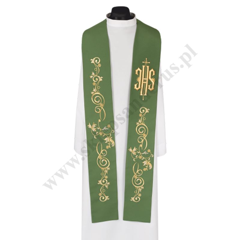 - Centralnym elementami stuły jest haftowany złotymi nićmi symbol IHS.