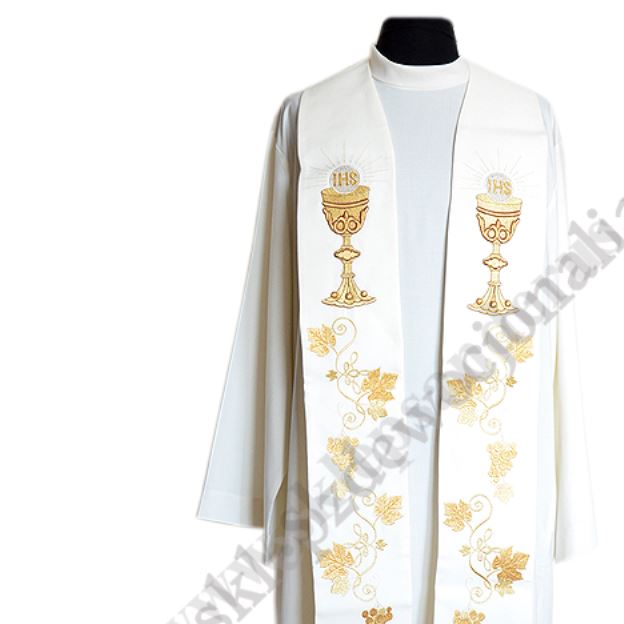 Stuła jednostronna wykonana z wysokiej jakości tkaniny gładkiej, zdobiona haftem z symbolami eucharystycznymi.