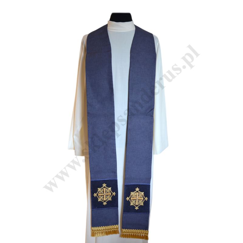 Stuła kapłańska z bogatym haftem przedstawiającym motyw krzyża i florystyczne ornamenty. Zakończona złotymi frędzlami. Szerokość stuły 16 cm.