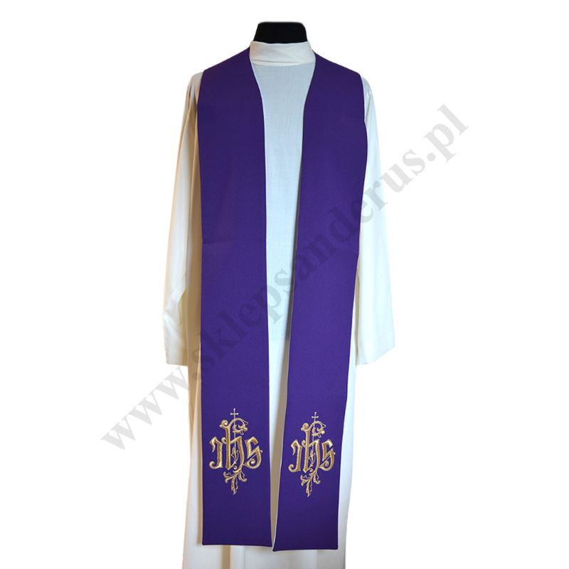 Stuła kapłańska fioletowo-biała z haftem przedstawiającym symbol IHS. Szerokość stuły 16 cm.