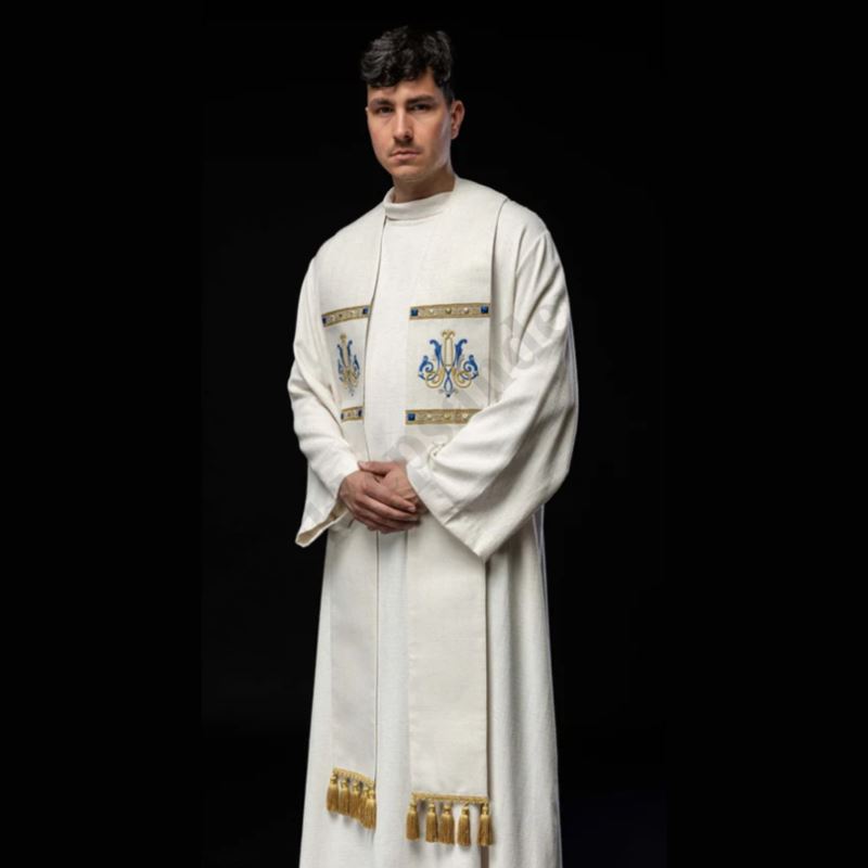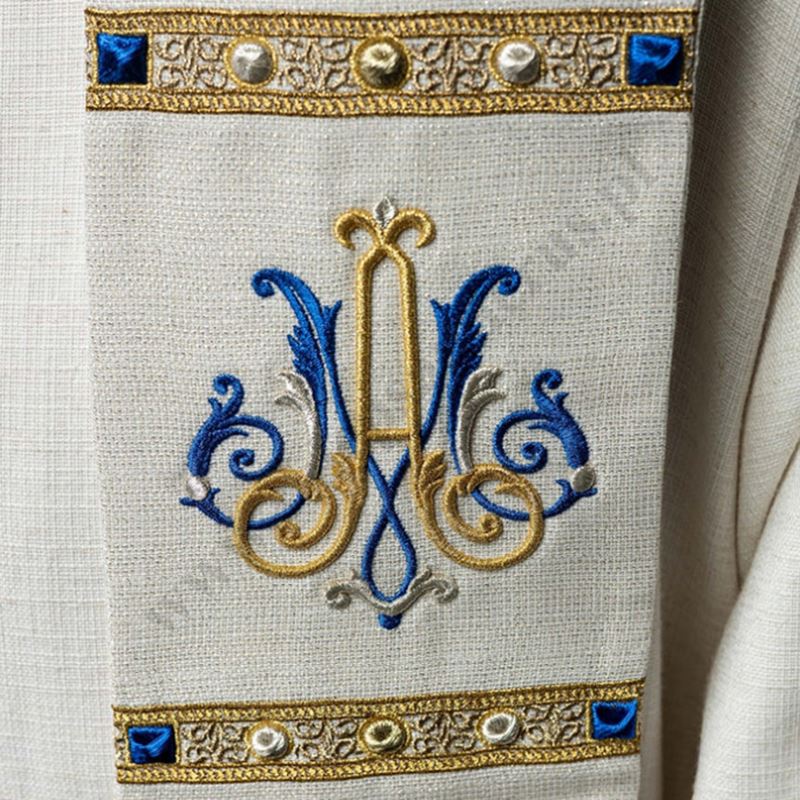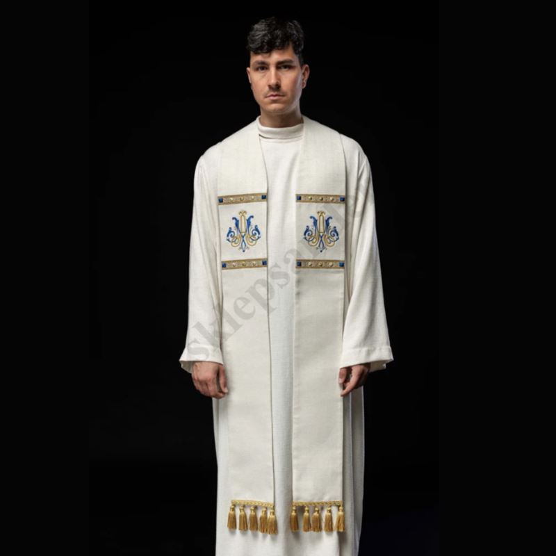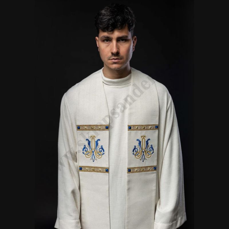 Elegancka stuła liturgiczna w kolorze ecru, ozdobiona klasycznym haftem maryjnym w odcieniach złota i błękitu. Wykonana z wysokiej jakości tkaniny żakardowej z dodatkiem bawełny, gwarantuje wygodę noszenia i trwałość.