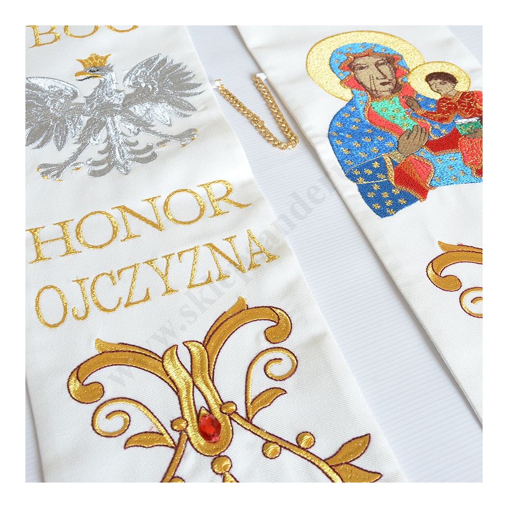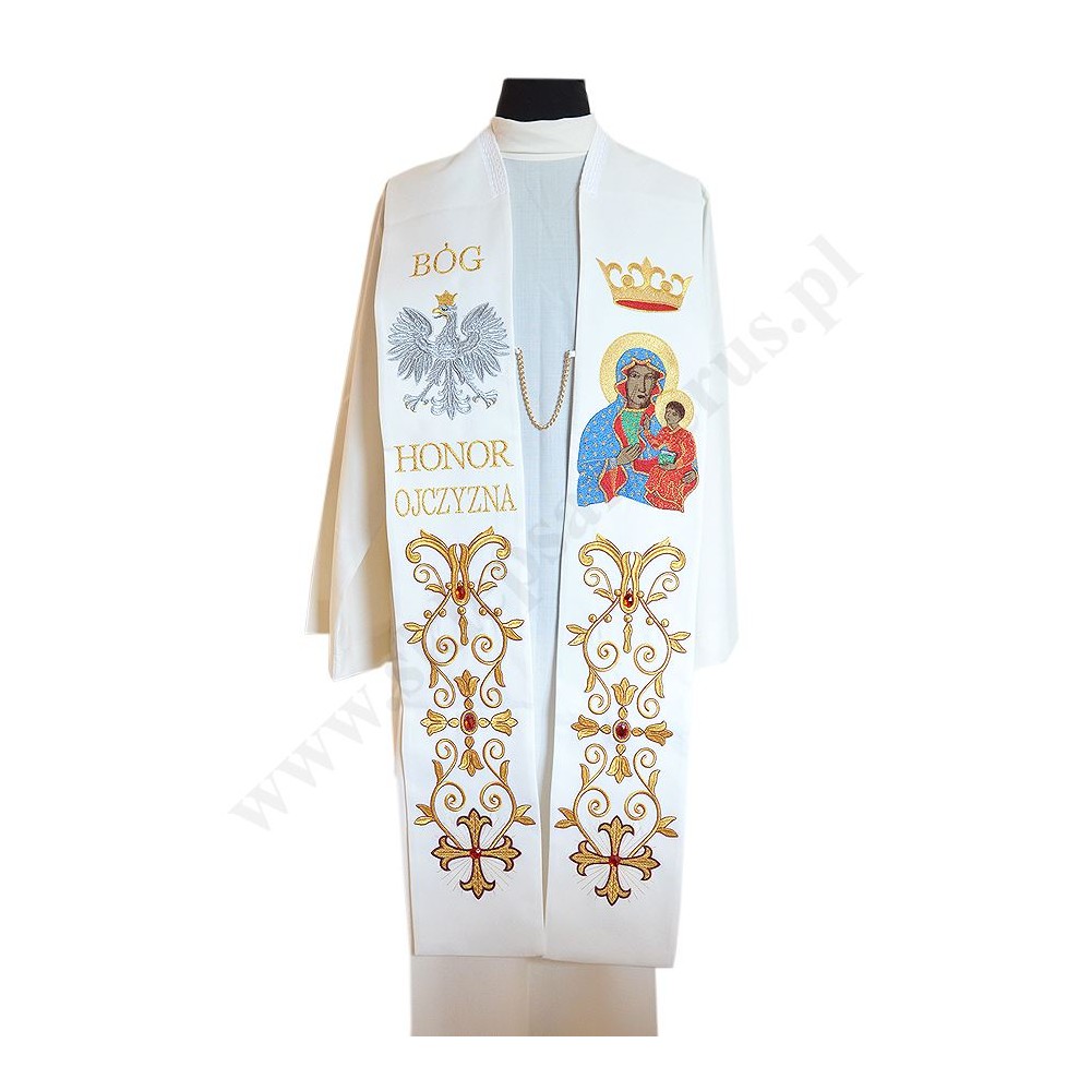 Bogato haftowana stuła patriotyczna z wizerunkiem Matki Bożej Częstochowskiej, dodatkowo zdobiona czerwonymi kamieniami. Szerokość stuły 17 cm, długość ramienia 130 cm.