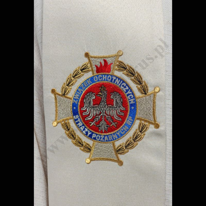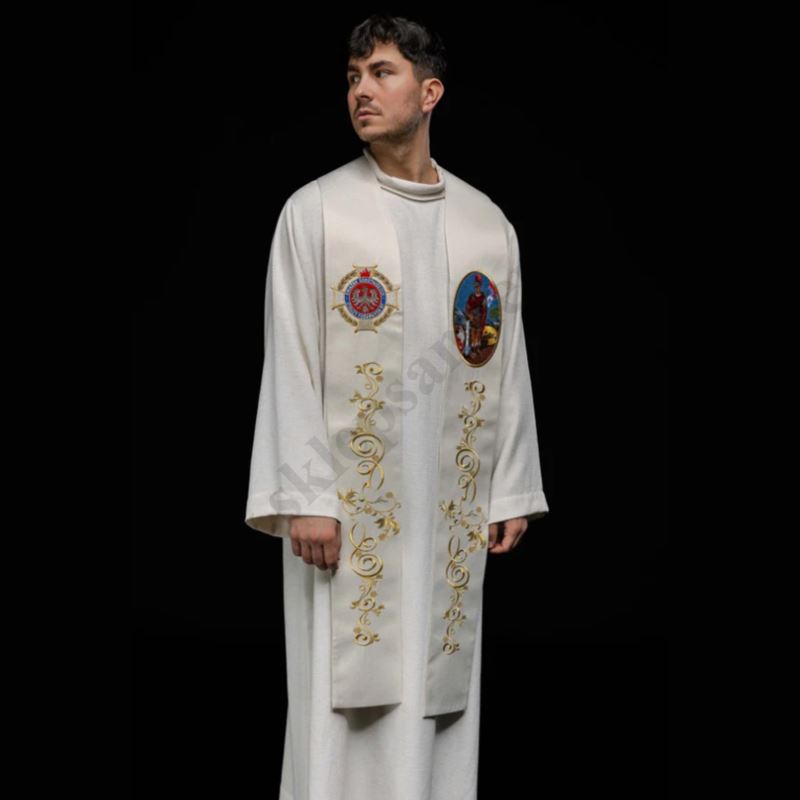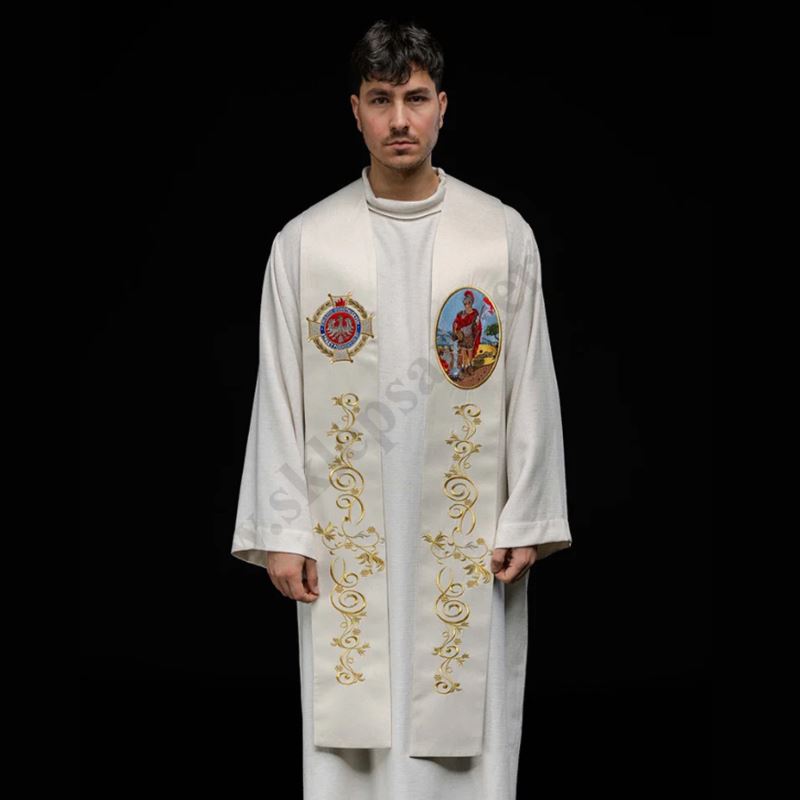 Stuła wykonana z wysokiej jakości tkaniny, zdobiona pasem z haftowanym wizerunkiem Świętego Floriana.