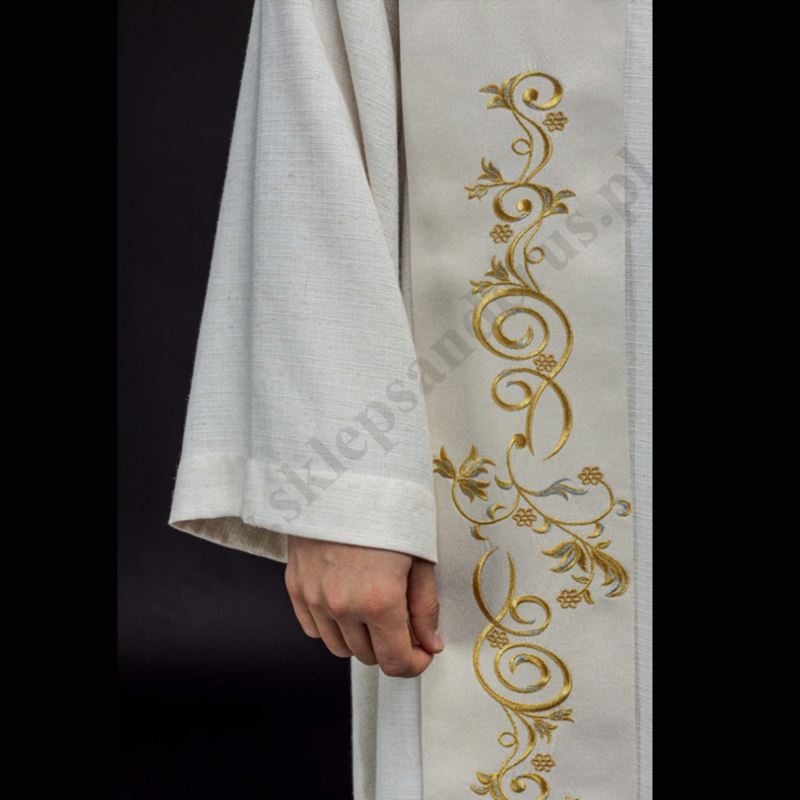 Stuła wykonana z wysokiej jakości tkaniny gładkiej, zdobiona haftowanym wizerunkiem Świętego Floriana oraz haftem florystycznym.