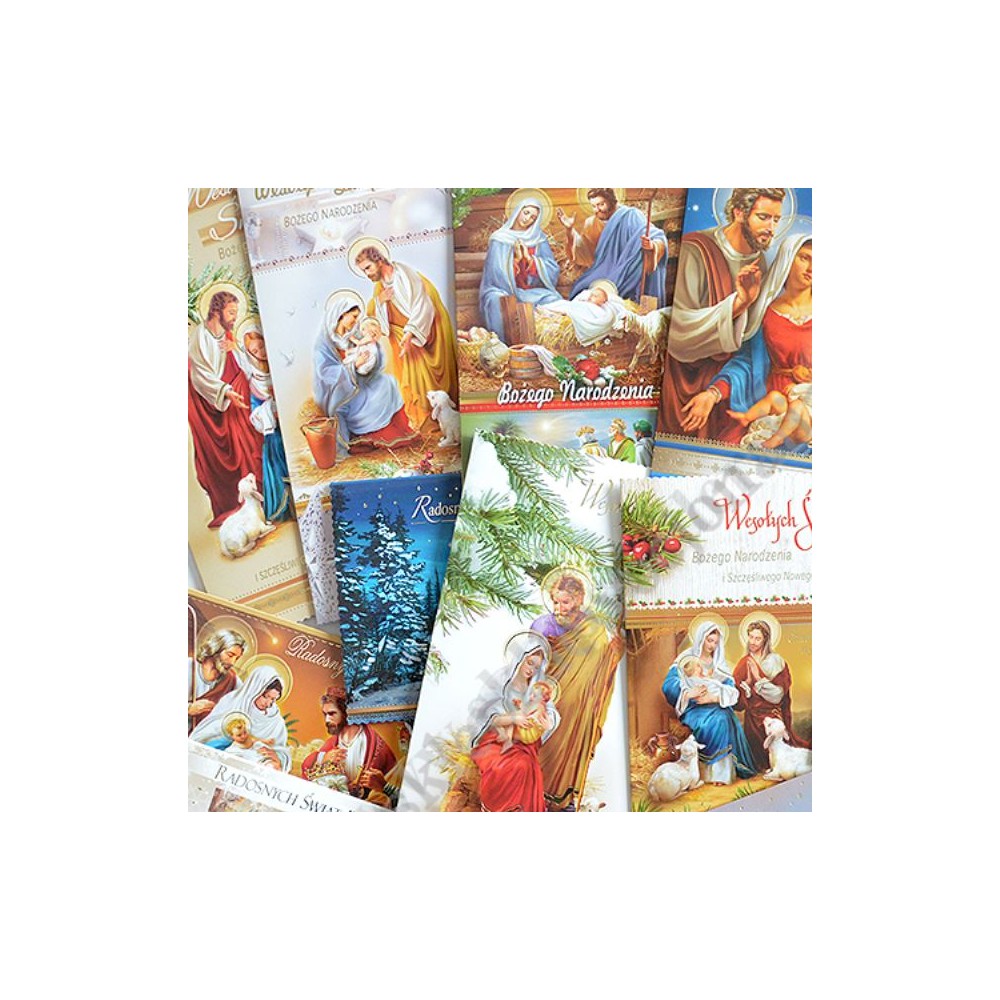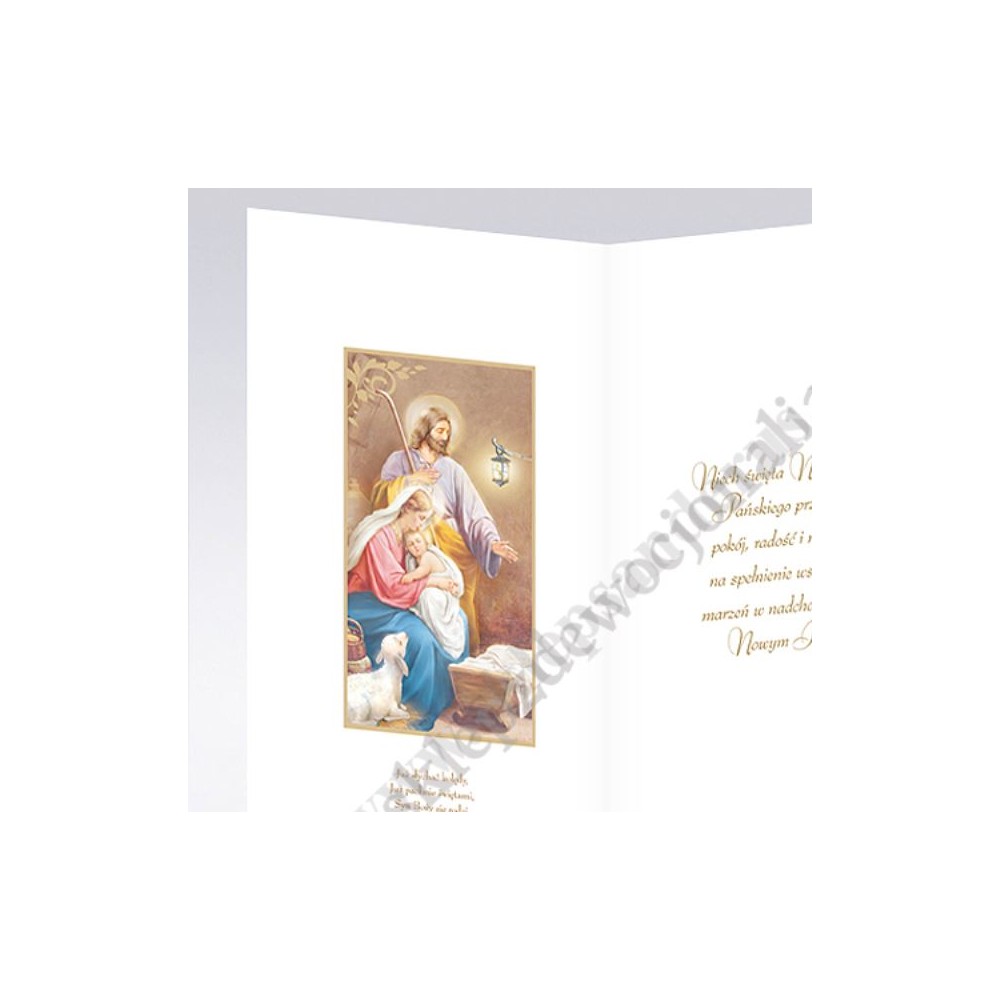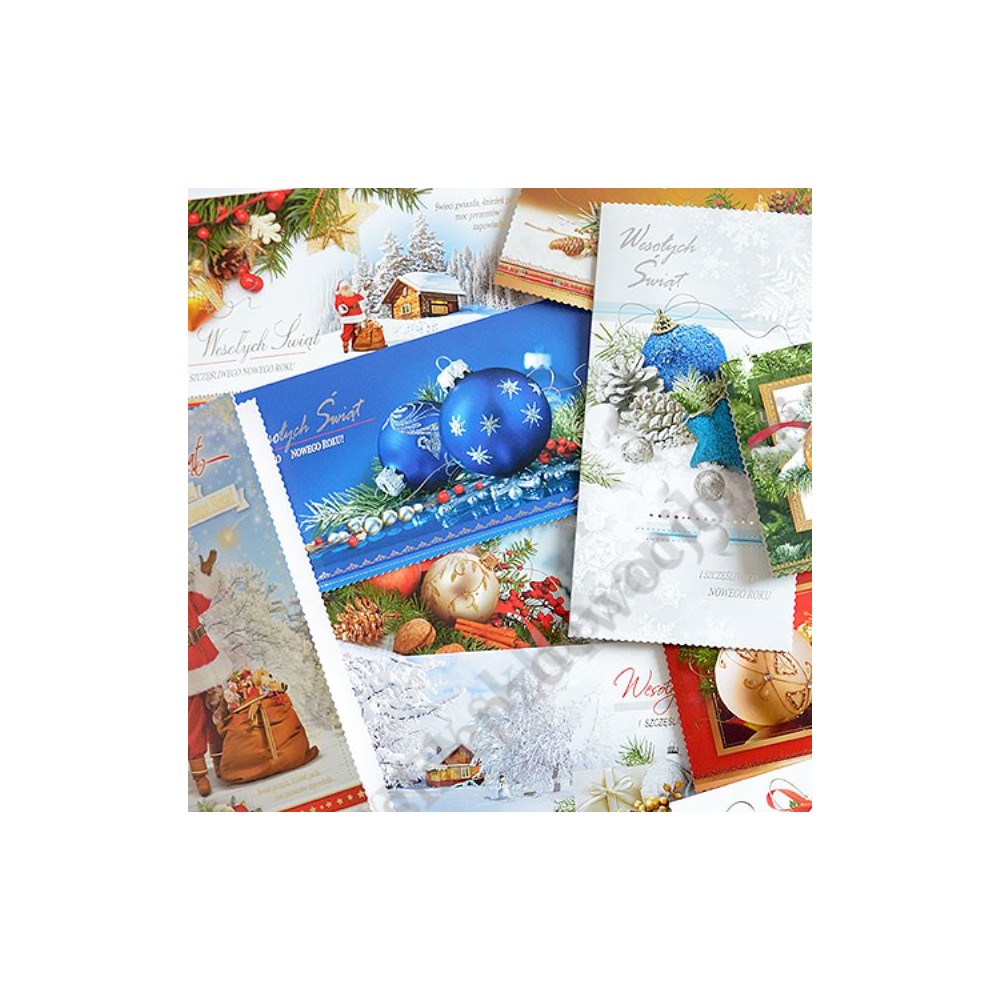 Kartka bożonarodzeniowa składana w formacie 105x210mm złocona, srebrzona i lakierowana, drukowana dwustronnie na kartonie 250g/m2, pakowana wraz z kopertą w torebkę foliową.