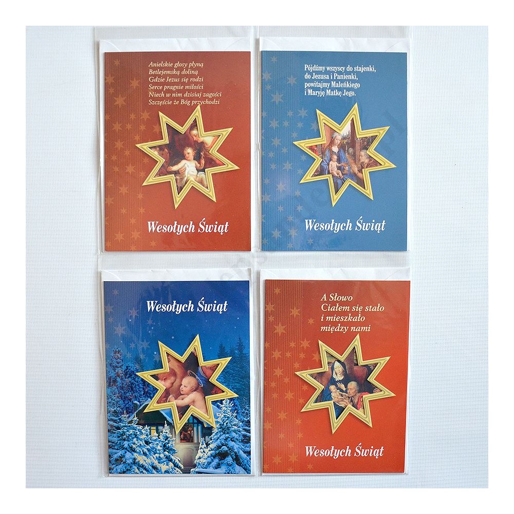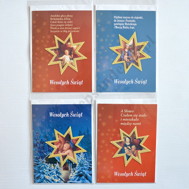 Kartka bożonarodzeniowa składana w formacie 120x160mm, lakierowana, wycinana, drukowana dwustronnie na kartonie, pakowana wraz z kopertą w torebkę foliową. Sprzedaż według losowo wybranych wzorów. Na zdjęciu pokazane są przykładowe wzory kartek.