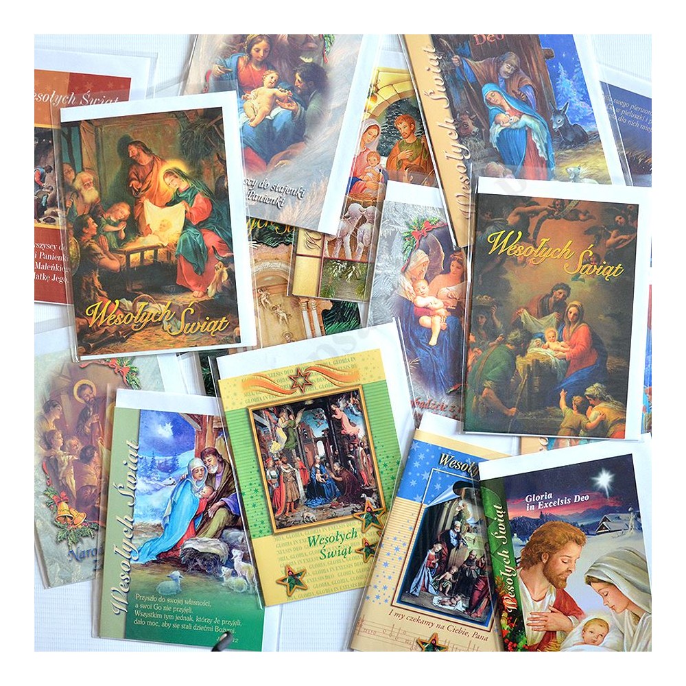 Kartka bożonarodzeniowa składana w formacie 105x150mm, lakierowana, drukowana dwustronnie na kartonie, pakowana wraz z kopertą w torebkę foliową. Sprzedaż według losowo wybranych wzorów. Na zdjęciu pokazane są przykładowe wzory kartek.