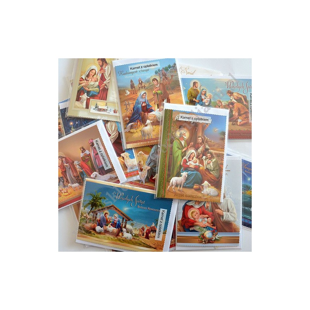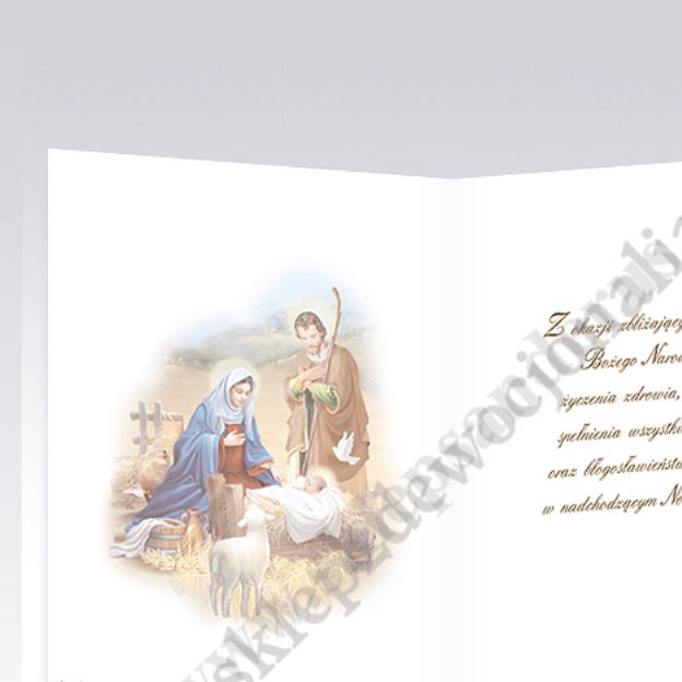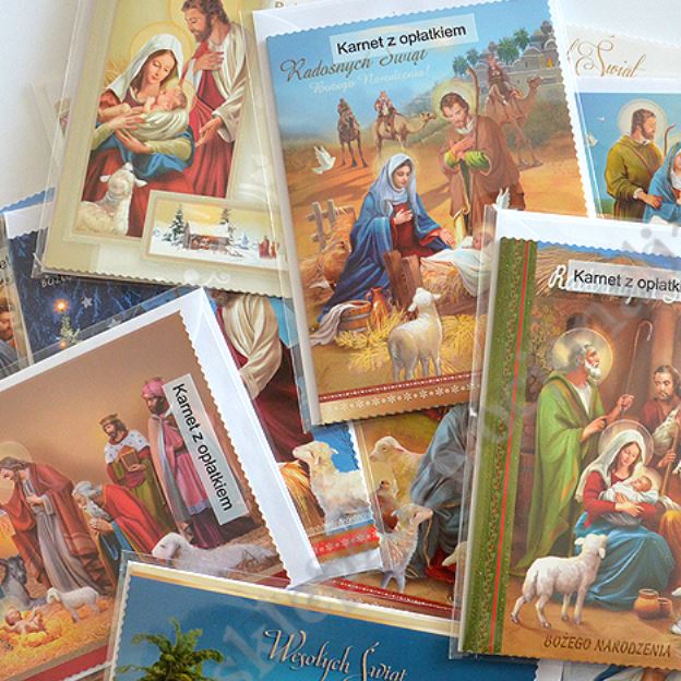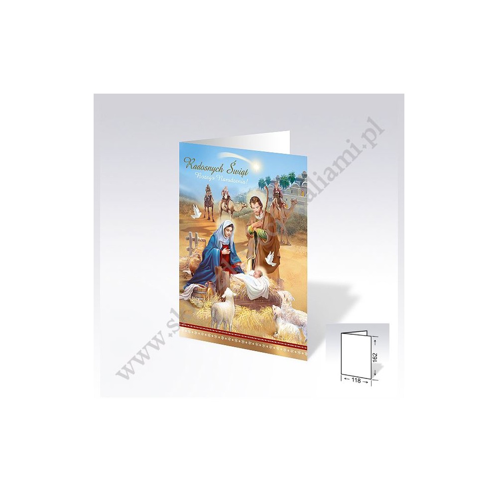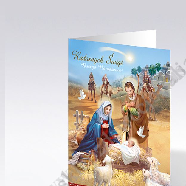 Kartka bożonarodzeniowa składana w formacie 118x162mm z opłatkiem, brokatowana i lakierowana, drukowana dwustronnie na kartonie 230g/m2, pakowanych wraz z kopertą w torebkę foliową.