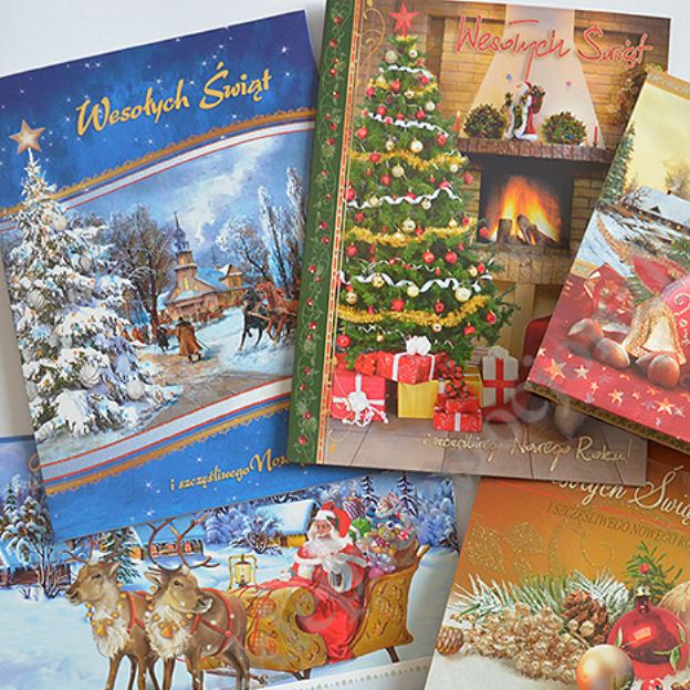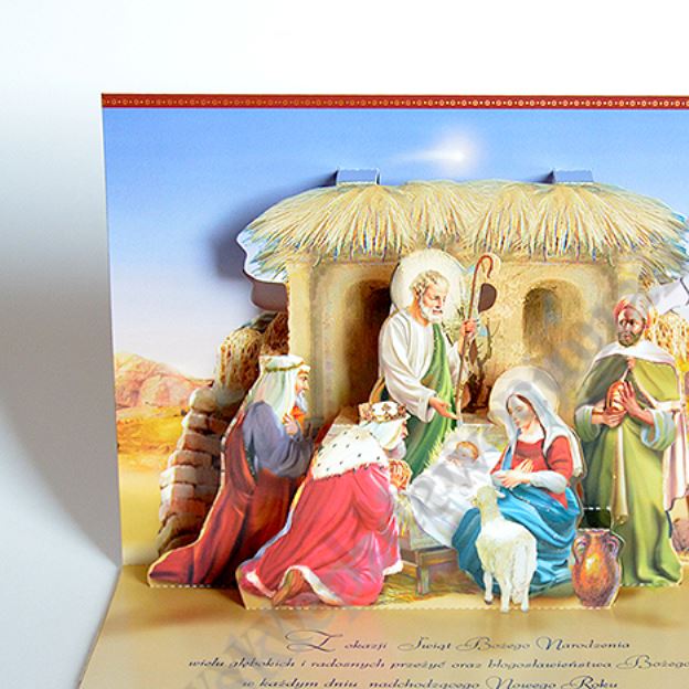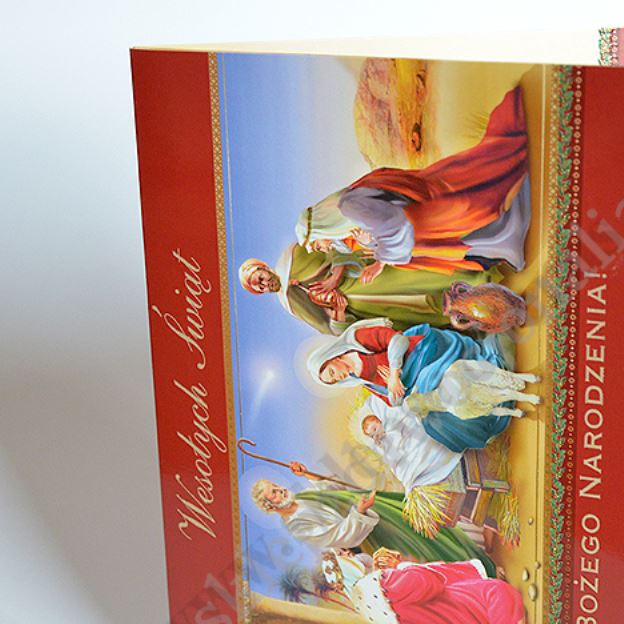 Kartka bożonarodzeniowa składana w formacie 137x187mm złocona, srebrzona i lakierowana, drukowana dwustronnie na kartonie 250g/m2, pakowana wraz z kopertą w torebkę foliową. Wewnąrz kartki umieszczona jest pięknie prezentująca się składana szopka