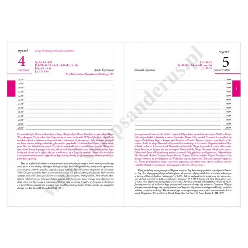 Terminarz zawiera teksty Ewangelii na każdy dzień roku z komentarzami św. Jana Pawła II oraz zaznaczone uroczystości, święta, wspomnienia liturgiczne i tygodnie brewiarzowe. W części informacyjnej znajdują się: spis świąt nakazanych, tabela świąt ruchomych, alfabetyczny spis Imion Świętych i Błogosławionych z datami wspomnień, informacje o Patronach Polski i Europy, warunki uzyskania odpustów, obietnice Matki Bożej dla odmawiających Różaniec oraz zachęty do praktykowania nabożeństw w ciągu tygodnia oraz pierwszych piątków i pierwszych sobót miesiąca.