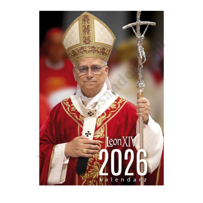 Kalendarz ścienny w układzie miesięcznym ilustrowany fotografiami papieża Leona XIV (dotychczas kard. Roberta Prevosta OSA), który został wybrany w dniu 8 maja 2025 roku. Czytelne kalendarium zawiera uroczystości i najważniejsze święta katolickie.