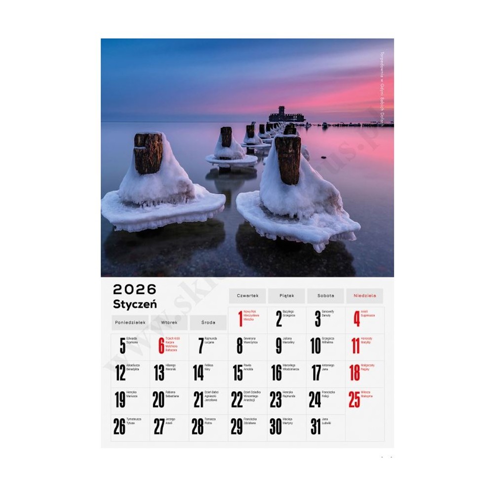 Kalendarz ścienny w układzie miesięcznym ilustrowany pięknymi zdjęciami przedstawiającymi różne zakątki Polski. Czytelne kalendarium pozwala zaznaczyć planowane wydarzenia.