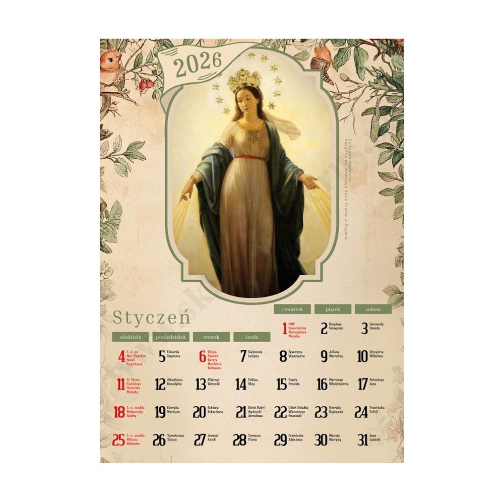 Kalendarz ścienny w układzie miesięcznym. Zdjęcia ilustrujące poszczególne miesiące roku przedstawiają wizerunki Matki Bożej z różnych miejsc w Polsce i nie tylko oraz dzieła sztuki. Czytelne kalendarium zawiera podstawowe informacje na temat świąt...