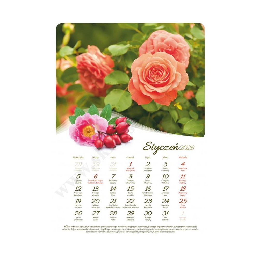 Kalendarz ścienny w układzie miesięcznym ilustrowany zdjęciami roślin mających właściwości lecznicze, np. róża, wiśnia, sosna. Fotografiom towarzyszą krótkie informacje o zdrowotnych właściwościach zaprezentowanych w kalendarzu roślin. Czytelne kalendarium pozwala zaznaczyć planowane wydarzenia.