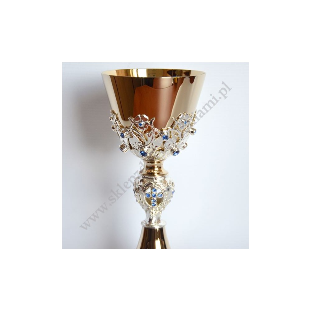 Kielich mszalny mosiężny, pozłacany i selektywnie srebrzony. Zdobiony elementami odlewanymi oraz niebieskimi kamieniami półszlachetnymi. Wysokość kielicha 22 cm.