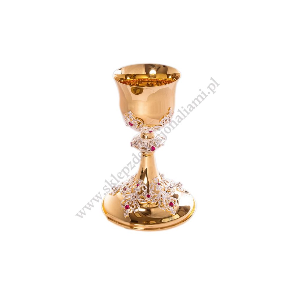 Kielich mszalny mosiężny pozłacany zdobiony srebrem i kamieniami półszlechetnymi. Wysokość kielicha 22 cm.