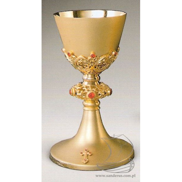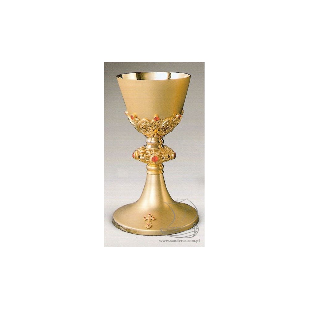 Kielich liturgiczny mosiężny, pozłacany z dodatkowo zdobionym koszykiem. Zdobienie kielicha wzbogacone o kamienie półszlachetne. Wysokość kielicha 21 cm.
