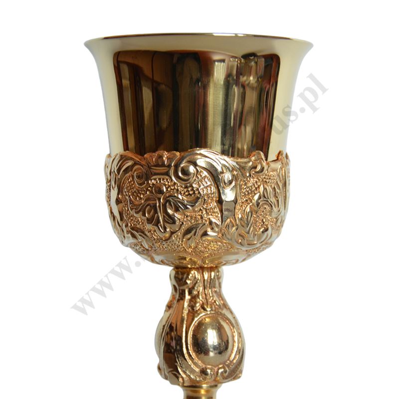 Kielich mszalny barokowy mosiężny, pozłacany o wysokości 25.5 cm, średnica czaszy kielicha 9.2 cm, średnica podstawy 14 cm.