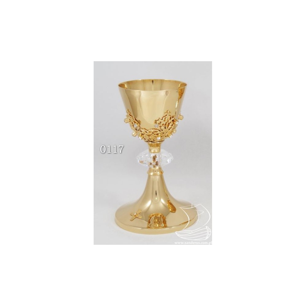 Kielich liturgiczny mosiężny, pozłacany, koszyk kielicha zdobiony ornamentami oraz białymi kamieniami półszlechetnymi. Nodus kielicha zdobiony kryształem, na stopce kielicha krzyżyk z kamieniem półszlachetnym. Wysokość kielicha 20 cm, średnica czaszy kielicha 10 cm.
