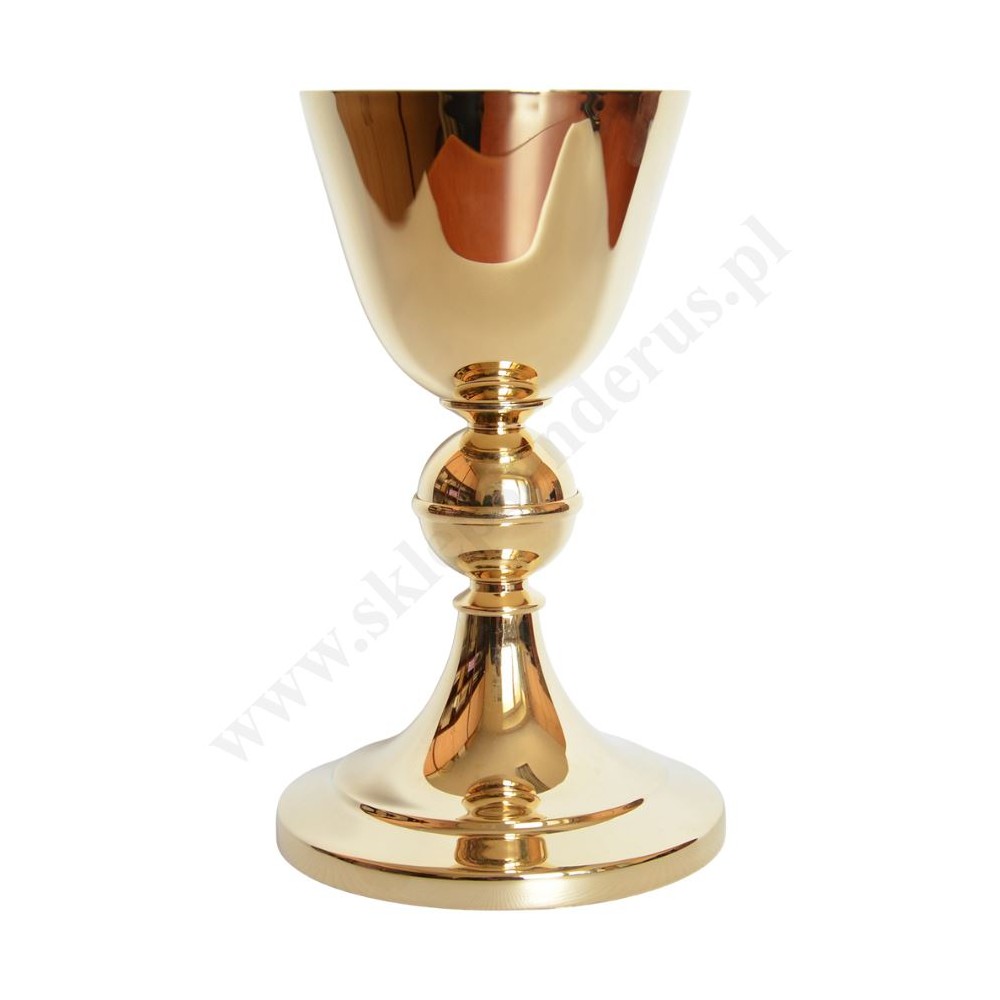 Kielich mosiężny, pozłacany o wysokości 19.5 cm, średnica czaszy kielicha 10 cm, średnica podstawy 12 cm.