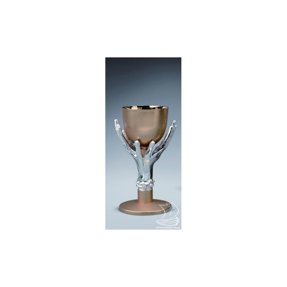 Kielich mosiężny, pozłacany, nodus kielicha posrebrzany o wysokości 21 cm.