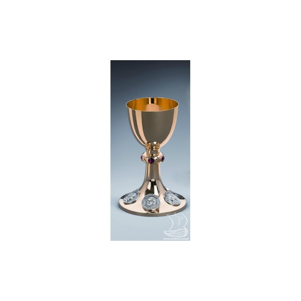 Kielich mosiężny, pozłacany o wysokości 23 cm.