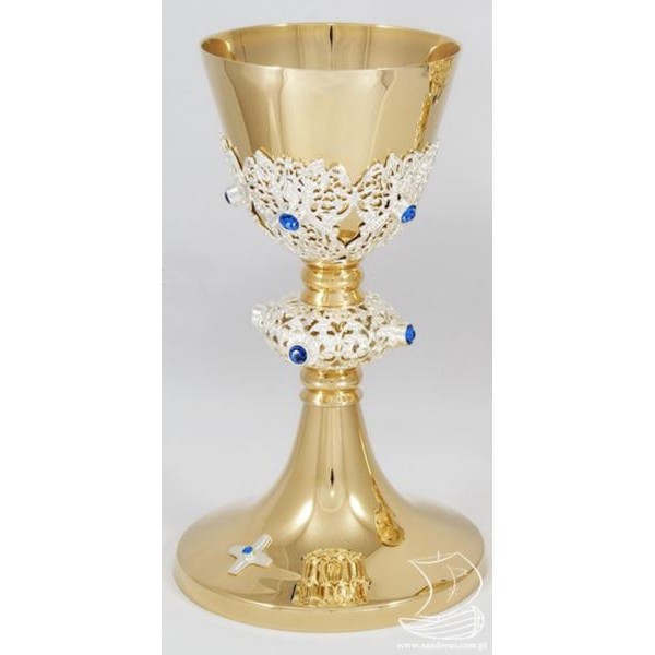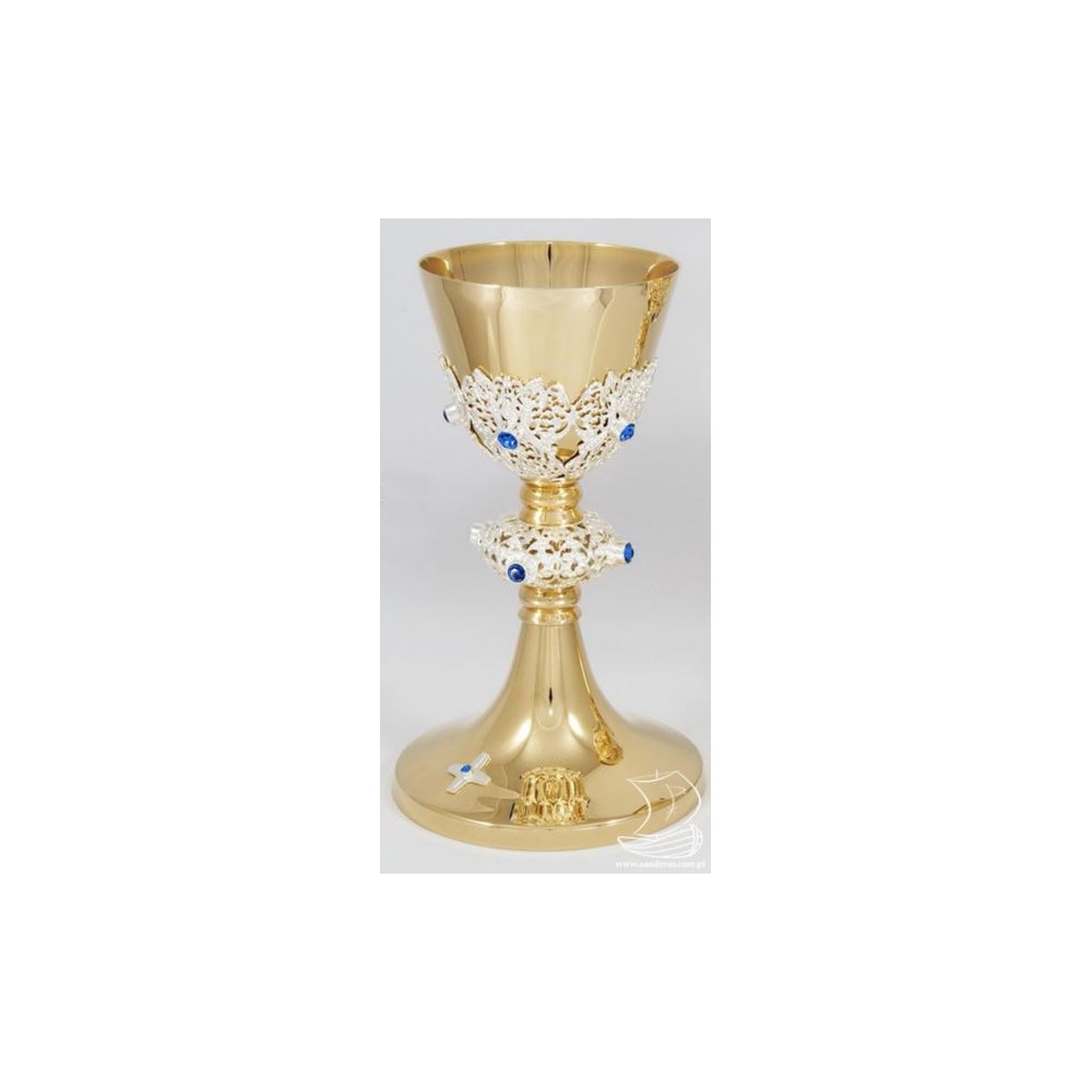Kielich mosiężny, pozłacany o wysokości 21 cm.