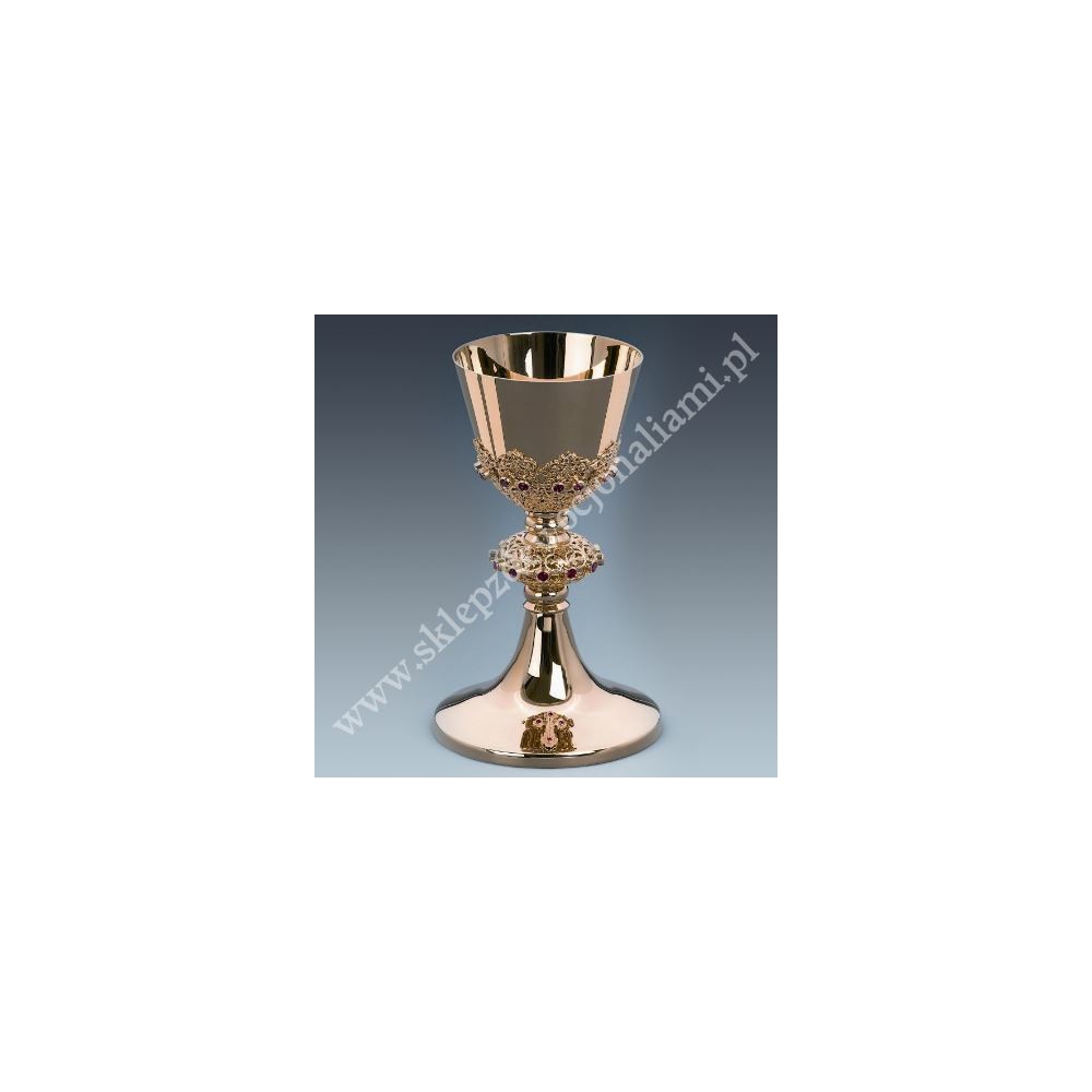 Kielich liturgiczny mosiężny, pozłacany. Dodatkowo zdobiony czerwonymi kamieniami półszlachetnymi.