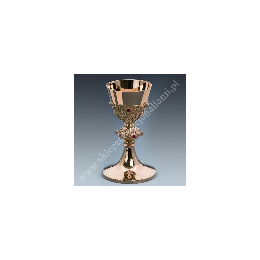 Kielich liturgiczny mosiężny, zdobiony czerwonymi kamieniami półszlachetnymi, koszyk oraz nodus kielicha dodatkowo zdobione.