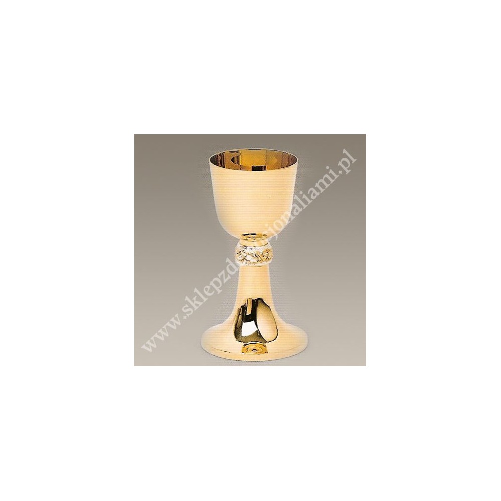 Kielich liturgiczny mosiężny, pozłacany ze zdobionym grawerem na nodusie kielicha. Wysokość kielicha 21 cm.