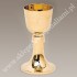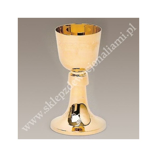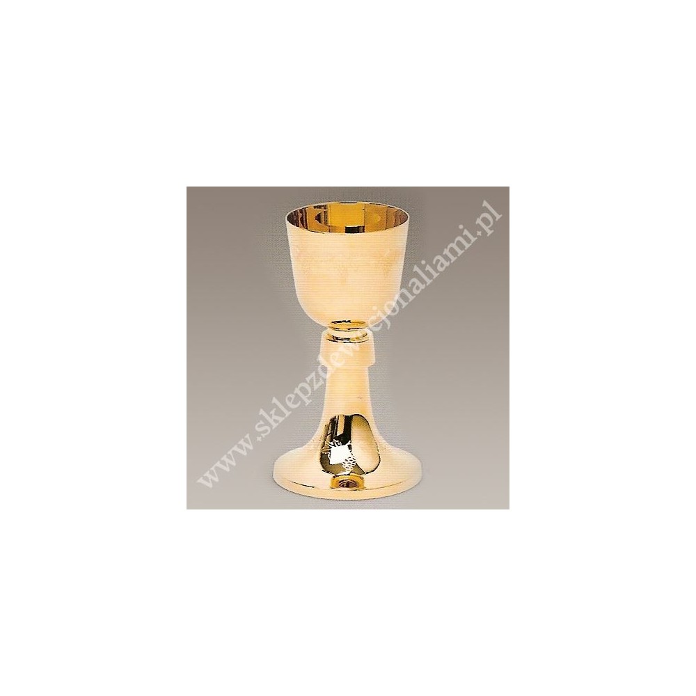 Kielich liturgiczny mosiężny, pozłacany ze zdobionym grawerem na podstawie i czaszy kielicha. Wysokość kielicha 21 cm.
