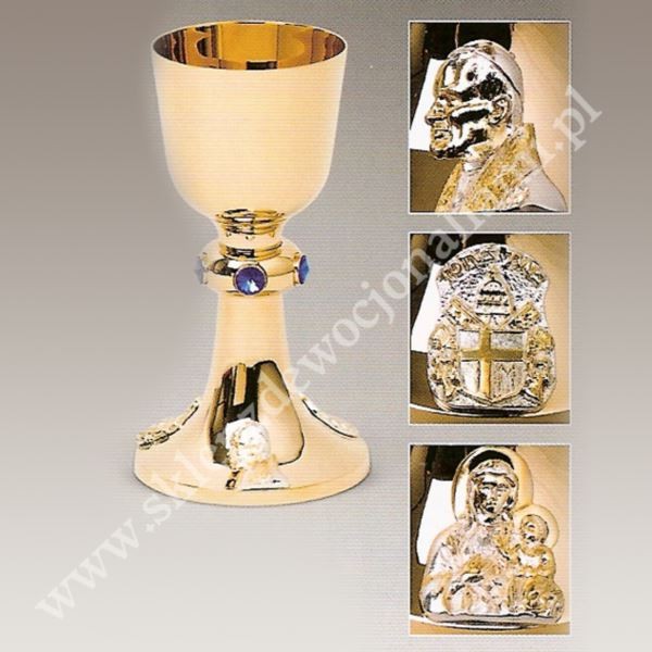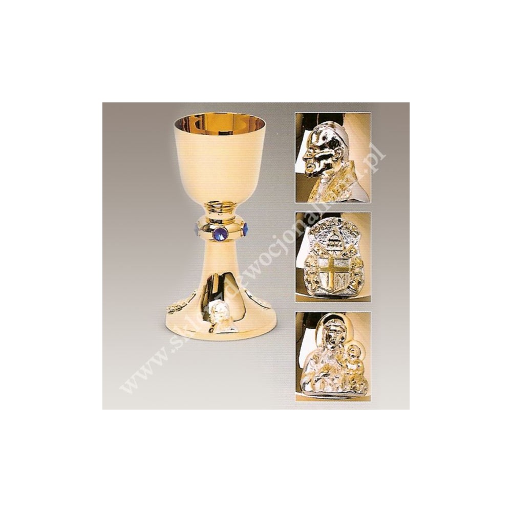 Kielich liturgiczny mosiężny, pozłacany zdobiony granatowymi kamieniami półszlachetnymi oraz zdobionymi grawerami na podstawie kielicha. Wysokość kielicha 21 cm.