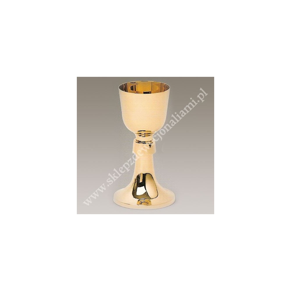 Kielich liturgiczny mosiężny, pozłacany o wysokości 21 cm.