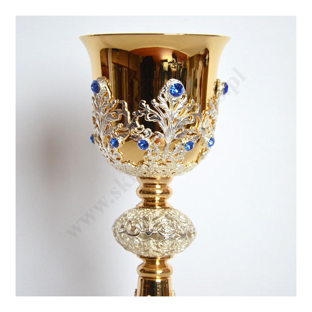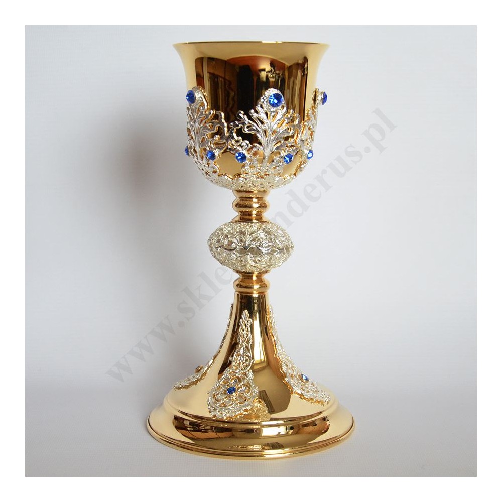 Kielich liturgiczny mosiężny, pozłacany o wysokości 24 cm, średnica podstawy 13.3 cm, średnica czaszy kielicha 9.7 cm. Kielich zdobiony dodatkowo srebrnymi ornamentami oraz niebieskimi kamieniami.
