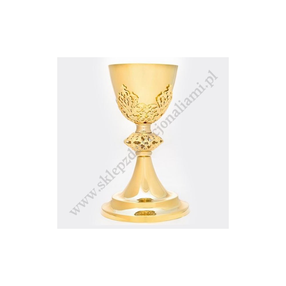 Kielich mszalny mosiężny, złocony. Zdobiony nodus oraz koszyk kielicha