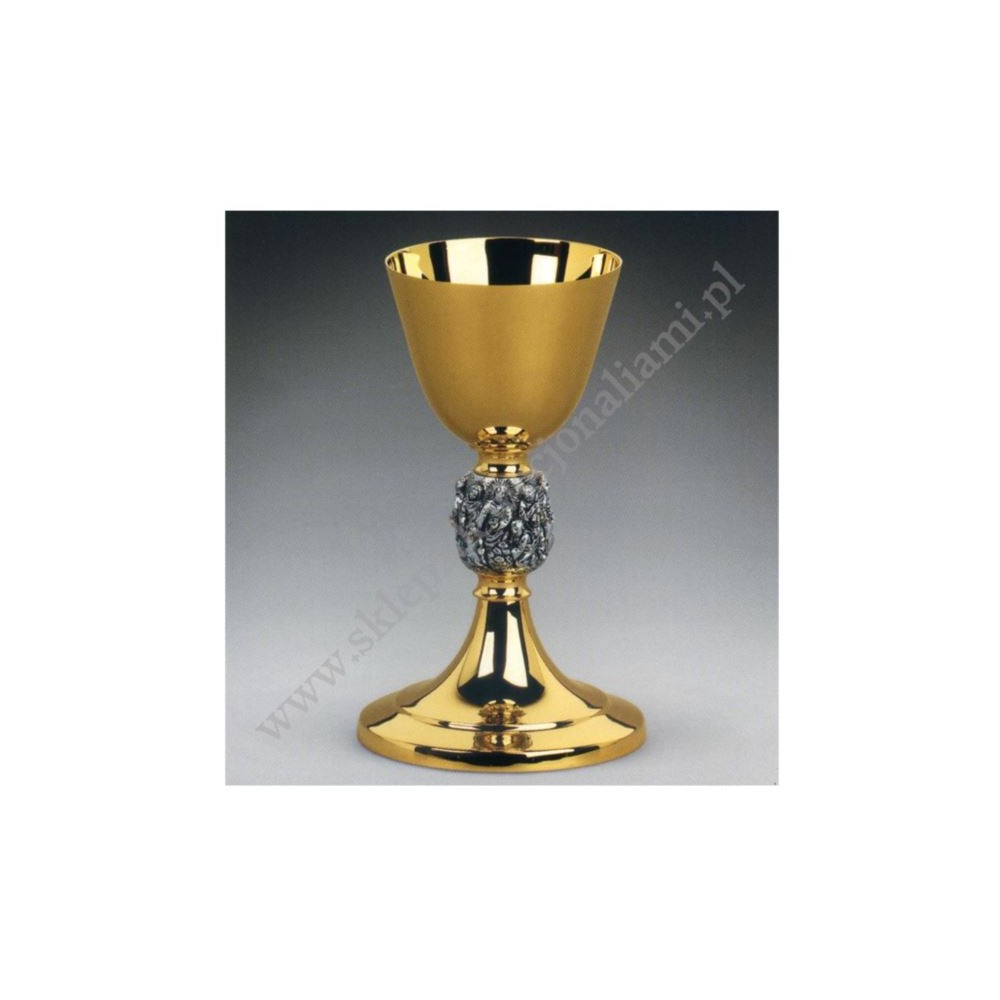 Kielich mszalny mosiężny, pozłacany o wysokości 21 cm, nodus kielicha wykończony w srebrze oksydowanym.