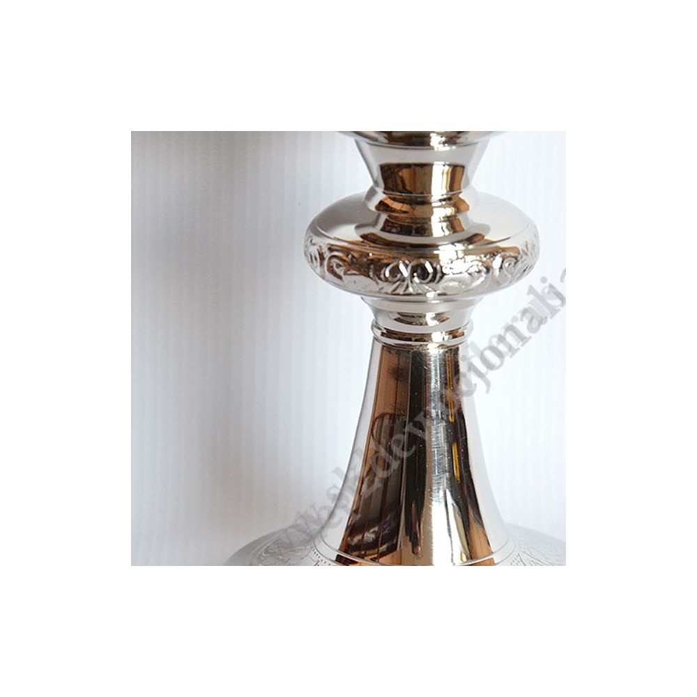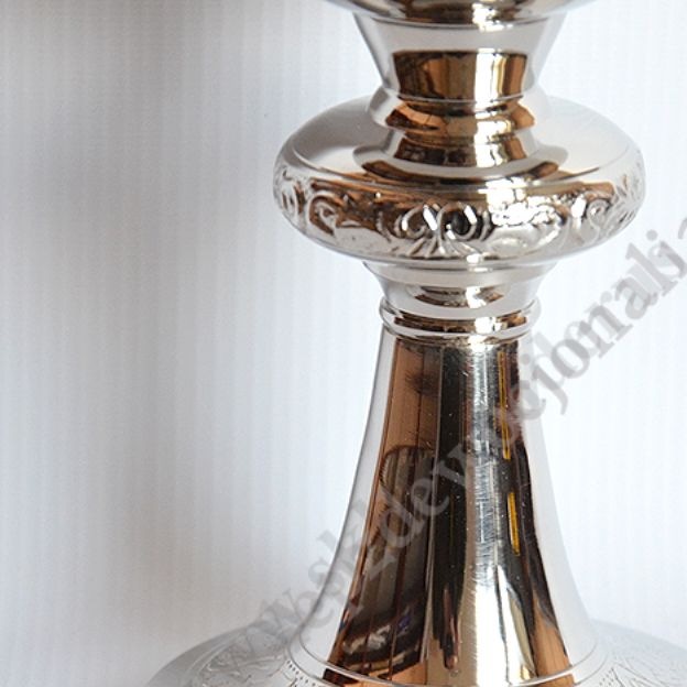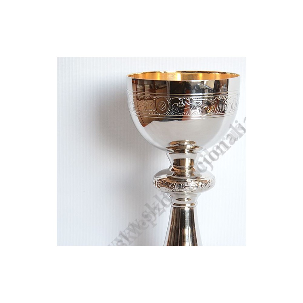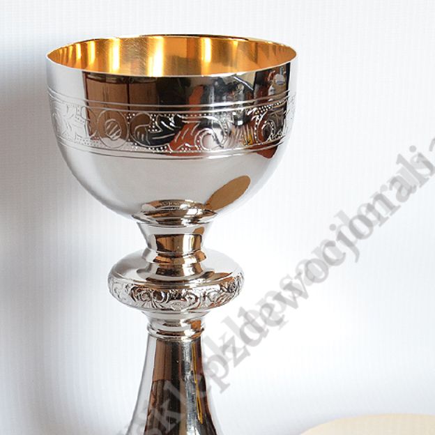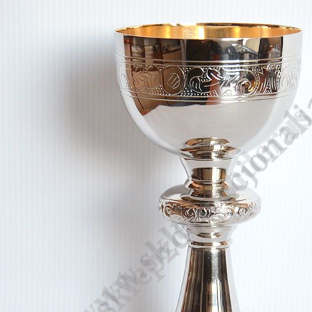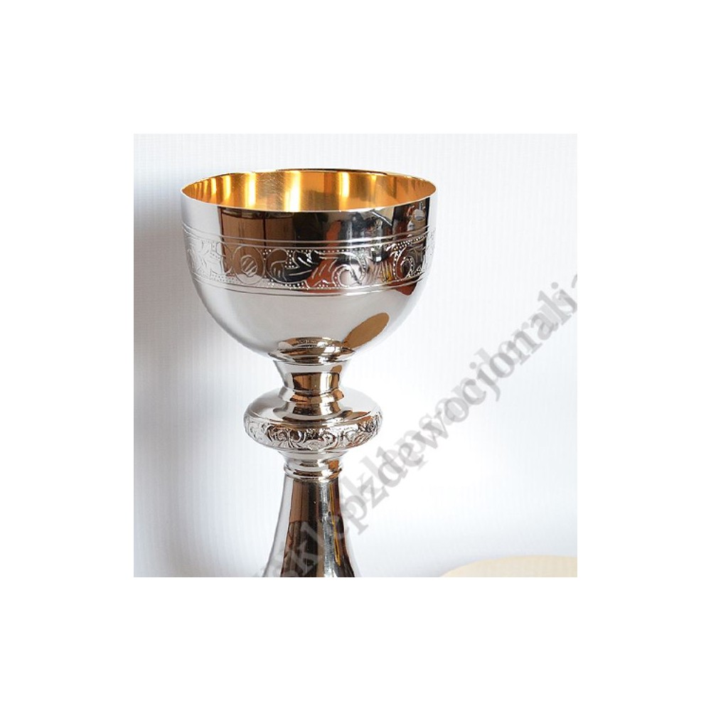 Kielich mszalny o wysokości 20 cm, mosiężny niklowany z pateną gładką, pozłacaną o średnicy 12.5 cm.