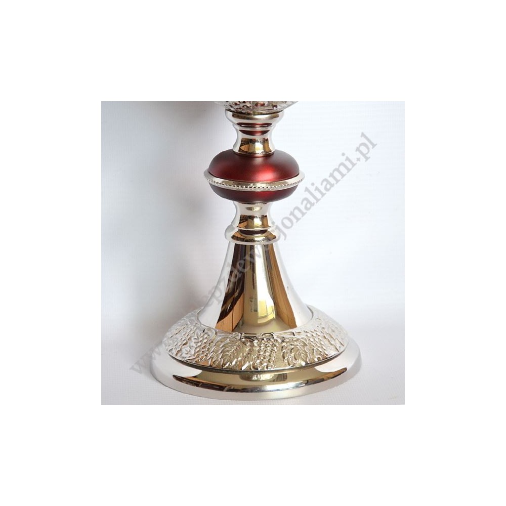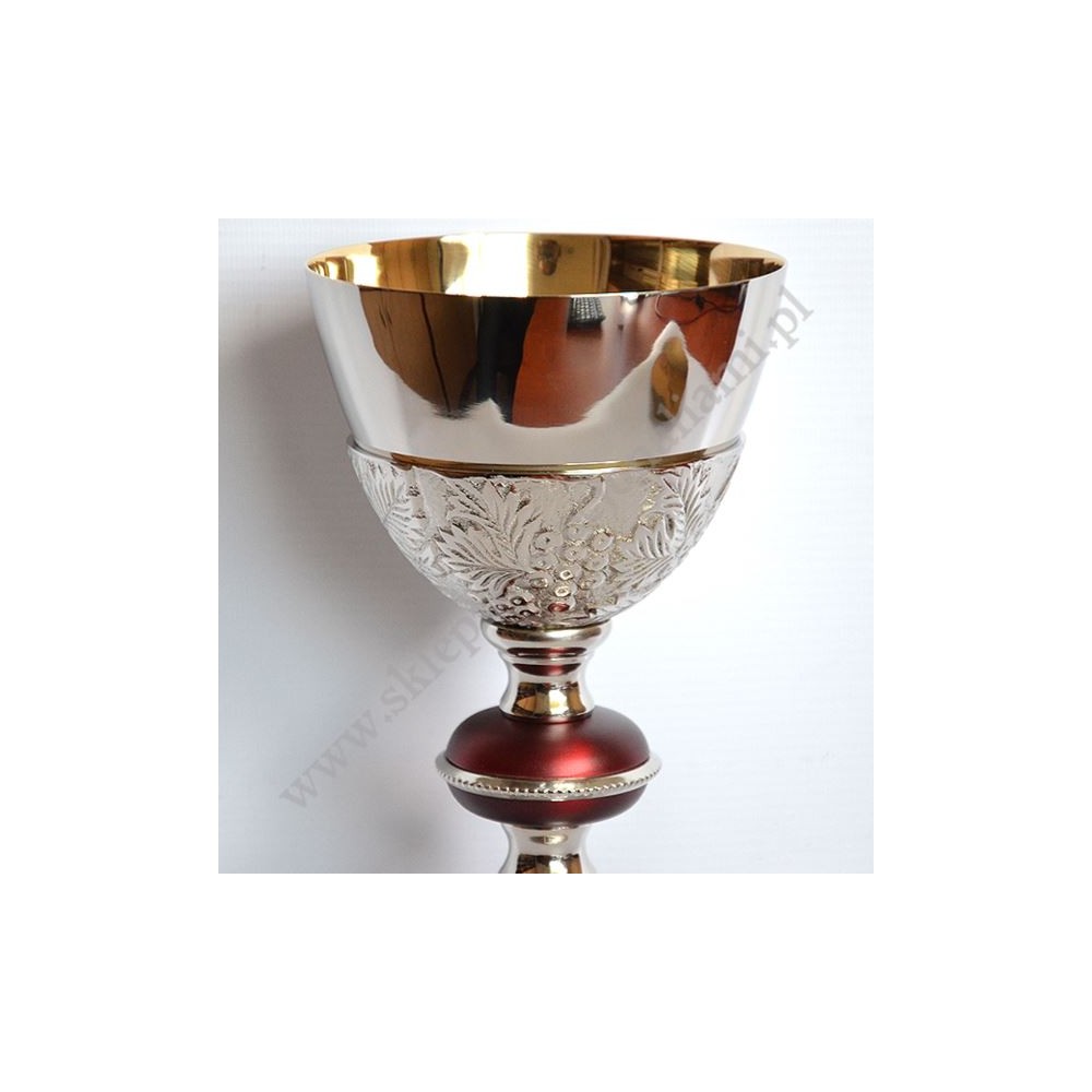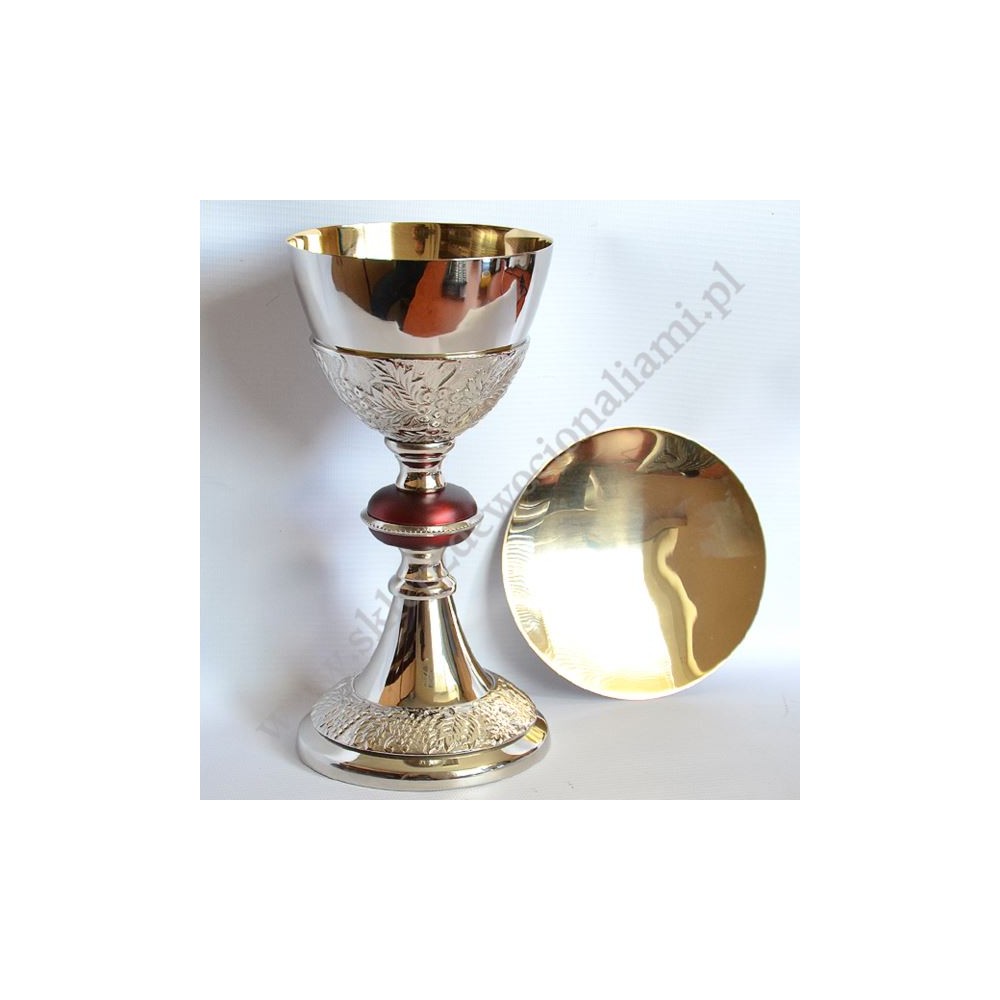 Kielich mosiężny, niklowany ze specjalnie zdobionym nodusem w komplecie znajduje się patena. Wysokość kielicha 23.5 cm, średnica czaszy kielicha 11.7 cm, średnica podstawy 12 cm, średnica pateny 13.8 cm.