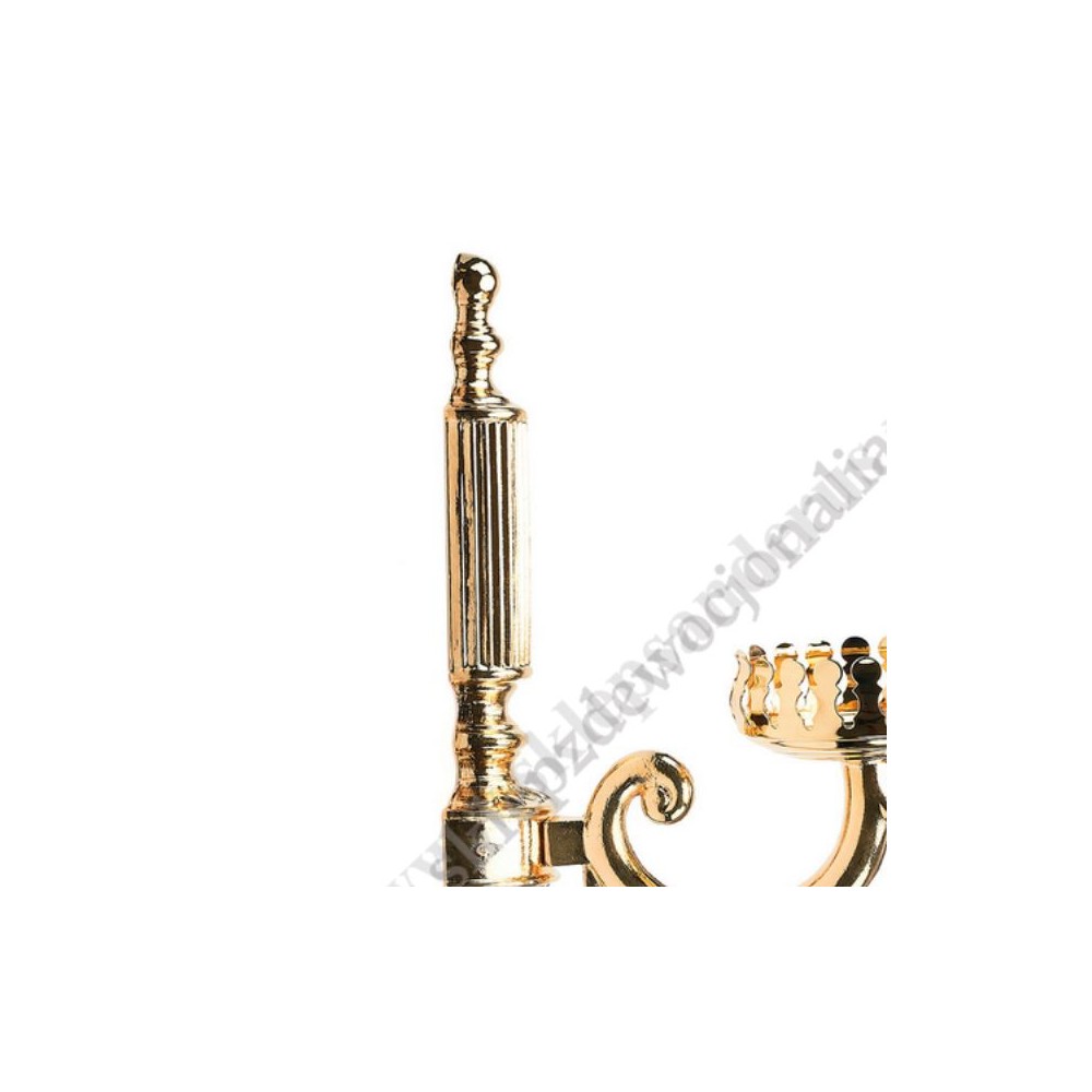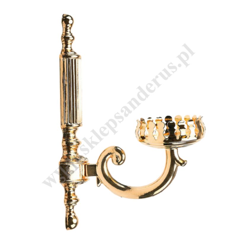 Lampa kinkiet, tzw. zacheuszka z uchwytem do pojemnika na olej. Wykonana z mosiężnego odlewu w kolorze złotym.