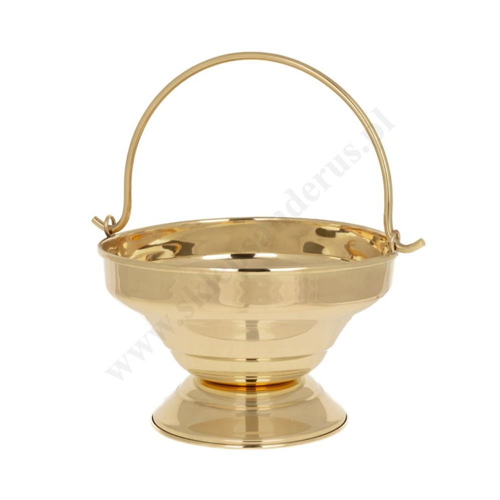 Kociołek na wodę święconą wykonany z polerowanej blachy mosiężnej, pokryty specjalnym lakierem.