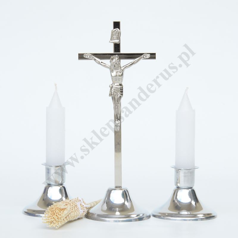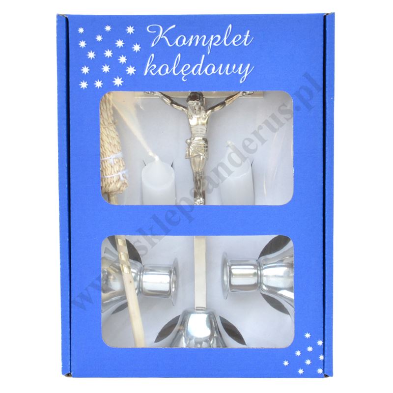 Komplet kolędowy wykonany z blachy niklowanej składający się z krzyżyka, dwóch lichtarzyków, dwóch świeczek oraz kropidła wiórkowego. Komplet zapakowany w kartonowe pudełko.