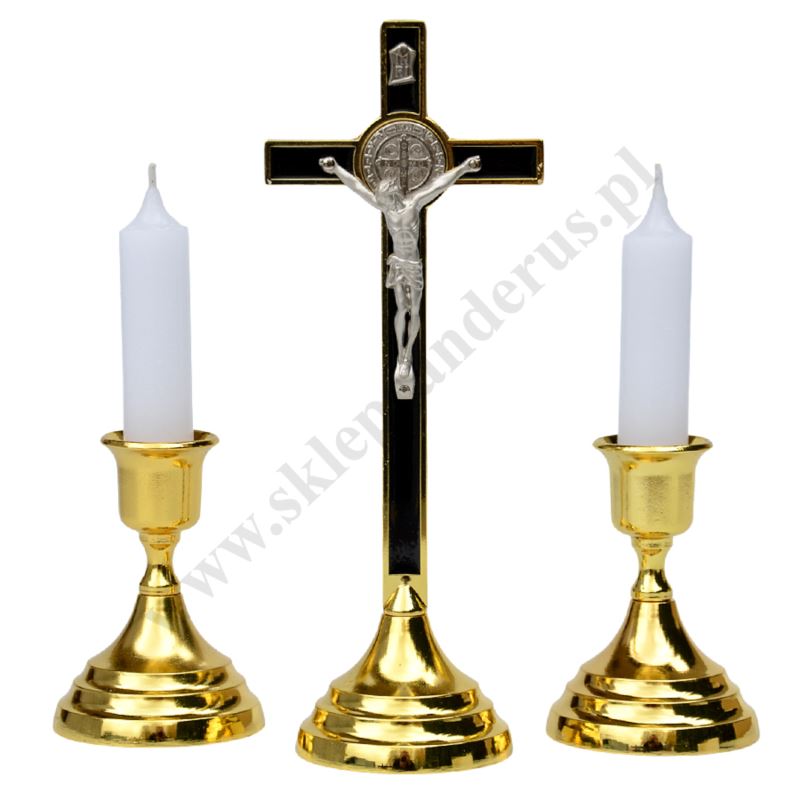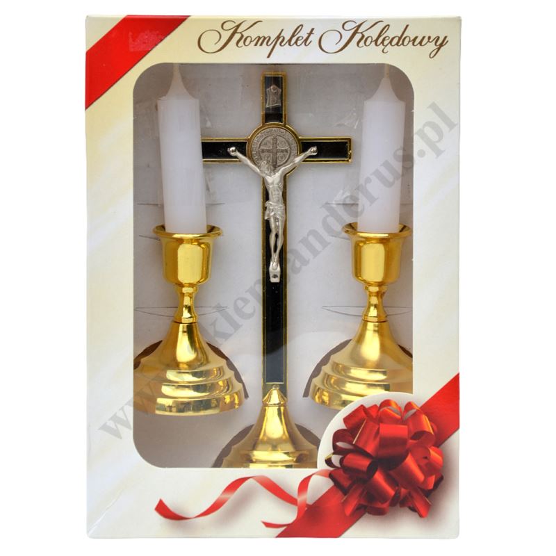Komplet kolędowy metalowy, składający się z krzyżyka, dwóch lichtarzyków oraz dwóch świec. Komplet zapakowany w kartonowe pudełko.